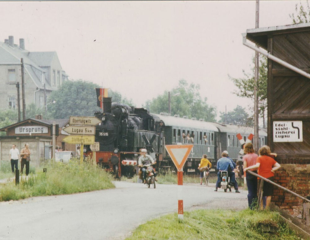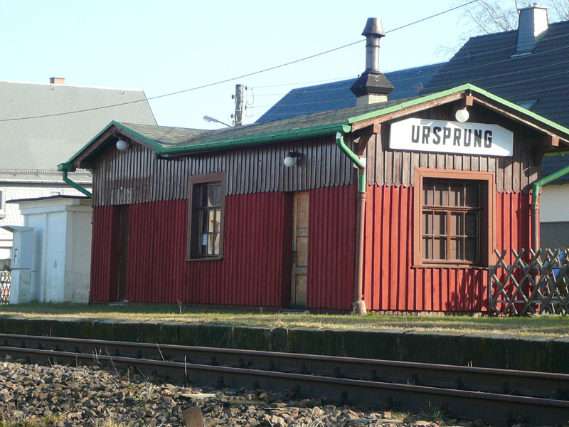 Die Station Ursprung liegt an der bereits am 15.11.1858 eröffneten Eisenbahnstrecke Wüstenbrand - Lugau zwischen den Haltepunkten Mittelbach und Erlbach-Kirchberg am Kilometer 7,5. Die Strecke wurde bis 1862 als reine Güterbahn zum Abtransport der Steinkohle aus dem Oelsnitz- Lugauer- Steinkohlerevier genutzt.Seit dem 01.10.1885 hielten die Züge am Haltepunkt Ursprung. Schon am 01.07.1903 wurde der beschränkte Stückgutverkehr eingeführt. In der 1902 errichteten Güterhalle übernahm Güteragent Münch diesen Posten und stellte gleichzeitig seine Restauration bis zur Fertigstellung der Wartehalle als Warteraum zur Verfügung. Der Bahnsteig besaß eine Länge von 113 m. Im Jahre 1904 erfolgte die Umwandlung in eine Haltestelle und die Einführung des “allgemeinen Güterverkehrs einschließlich Tierverkehr”. Die Einweihung des Bahnhofsgebäudes fand am 23.11.1910 statt. Ein Überholgleis wurde 1912 errichtet. Bis zum 18.10.1971 war der jetzige Haltepunkt ein Bahnhof mit drei Gleisen und zuletzt zwei Einfahr- und drei Ausfahrsignale, wobei das in Richtung Wüstenbrand die Funktion eines Gruppenausfahrsignales besaß. Bis zur Umwandlung des Haltepunktes in einen Bahnhof wurden auch hier die Züge mittels Scheibensignalen gestellt. Später sicherte man die Zugfahrten über ein Kurbelwerk mit Schlüsselblock. (Mittels Schlüssel konnte eine Abhängigkeit der Weichen / Fahrstraße hergestellt werden, die durch den Schlüsselblock verschlossen wurde.) In den Jahren 1928 bis 1934 gab es heftige Debatten, die Haltestelle Ursprung in Ursprung - Leukersdorf umzubenennen, was durch heftige Proteste der Gemeinde Ursprung ausblieb. Das Bahnhofsgebäude hatte die typische sächsische Einheitsform mit Wartehalle für Reisende und Dienstraum des Fahrdienstleiters. Das Kurbelwerk befand sich in einer provisorischen Hütte neben dem Gebäude. Der Fahrdienstleiter hatte neben den üblichen Fahrdienstleitertätigkeiten, welche auch den Fahrkartenverkauf und die Güterabfertigung einschlossen, die mechanische Schranke zu bedienen. In bestimmten Epochen sogar sehr oft am Tag, denn diese Strecke galt einst als drittrentabelste Deutschlands. - Seit langem Geschichte! Ursprung wurde 1971 zum Haltepunkt zurückgebaut und erhielt am 13.04.1976 eine zugbediente Halbschrankenanlage, die bei Gewitter fast ständig den Dienst versagte. Als Anfang der 70er Jahre des 20. Jhs. der Steinkohlebergbau eingestellt wurde, verlor die Strecke ihre Bedeutung und wurde ab 1984 auf ein Zugpaar im Personenverkehr pro Tag begrenzt, welcher am 10.08.1990 gänzlich eingestellt wurde. Danach diente die Strecke zeitweise als Abstellgleis für ausrangierte Zementsilo- und Personenwagen.